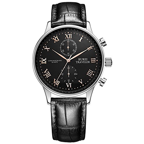 Best Seller! BUREI Chronograph Black Mens Watches with Leather Strap and Roman Numerals Display Review