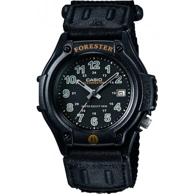 This men's Casio Forester watch is made from stainless steel and is fitted with a quartz movement. It is fastened with a black velcro strap and has a black dial. The watch has a date function.