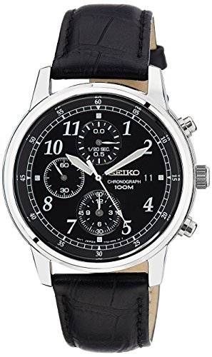 Seiko Men's Sports Watch. Analogue Quartz. Japanese Movement. Black Round Dial. illumines Hands and White Arabian Number Markers. Second Hand. Date Display. 1/20 Sec Chronograph. Polished Stainless Steel Case & Case Back. Case Diameter: 40mm, Case Depth: 9mm. Hardlex Crystal Glass. 100 Meter Water Resistant. Black Leather Strap. Steel Buckle. Band Width: 19mm. Watch Weight: 60 Grams. This Seiko Wrist Wear Comes with Seiko Warranty & Presentable Gift Box.